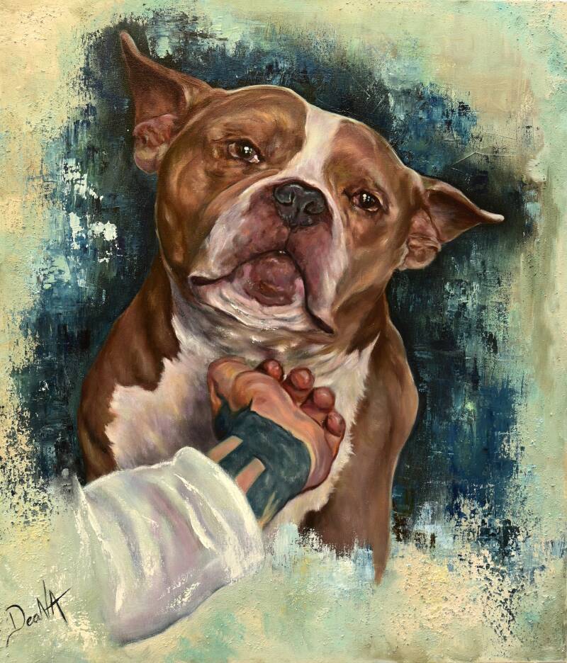 Een bijzonder portret dat ik maakte van Vito, samen met de hand van zijn baasje - hun laatste kroel, vastgelegd in verf en een beetje van zijn as! Een tastbare herinnering, een blijvend stukje liefde.
